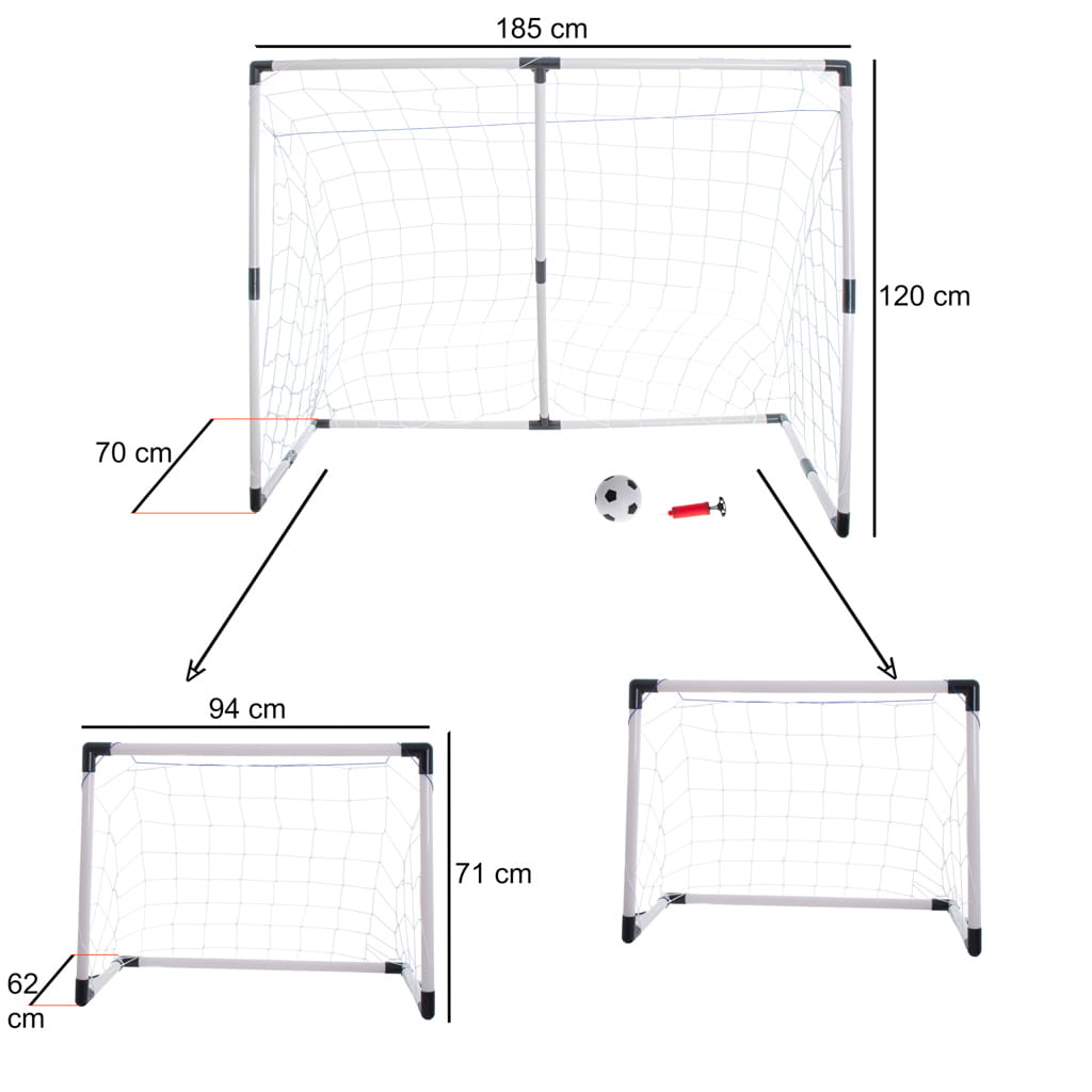BRAMKA PIŁKARSKA BRAMKA DO PIŁKI NOŻNEJ DLA DZIECI 2W1 185X120X70CM Wszyscy wiemy, że sport to zdrowie, jednak czasem zachęcenie dziecka do ruchu może być trudne! Na pewno pomogą mu odpowiednie bramki piłkarskie! Takie bramki treningowe zapewnią mnóstwo zabawy bezpośrednio pod domem! Bramki piłkarskie sprawdzą się idealnie również w przypadku, gdy w Twojej rodzinie wzrasta wschodząca gwiazda piłki nożnej! Składane bramki pozwolą mu ćwiczyć w każdej wolnej chwili! Przenośne bramki piłkarskie postawisz w dowolnym miejscu podwórka! Ba, nie wymagają nawet zbyt wiele miejsca, abyście mogli rozpocząć zabawę! Dzięki modułowej konstrukcji po złożeniu powstanie jedna duża bramka piłkarska lub dwie małe bramki - pozwoli wam to dostosować się do wymiarów i rodzaju boiska! Wymiary w dużej opcji to aż 185 cm szerokości na 120 cm wysokości!