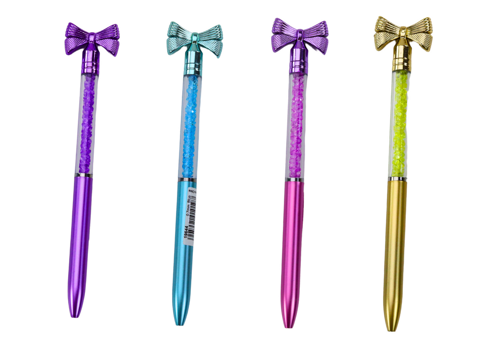 Ten wyjątkowy długopis to połączenie elegancji i funkcjonalności. Na jego końcu znajduje się kokardka, która nadaje mu eleganckiego wyglądu. Przeźroczysta obudowa, wypełniona malutkimi, błyszczącymi diamencikami, tworzy efektowne refleksy świetlne, które podkreślają jego luksusowy charakter. Niebieski tusz sprawia, że długopis jest idealnym towarzyszem na co dzień i na wyjątkowe okazje. To doskonały wybór dla tych, którzy chcą dodać odrobinę blasku i elegancji do swoich notatek lub korespondencji. W opakowaniu zbiorczym znajduje się 48 długopisów, co czyni go praktycznym rozwiązaniem dla uczniów i biur. Długopisy są dostępne w różnych kolorach, co pozwala na wybór ulubionego odcienia.