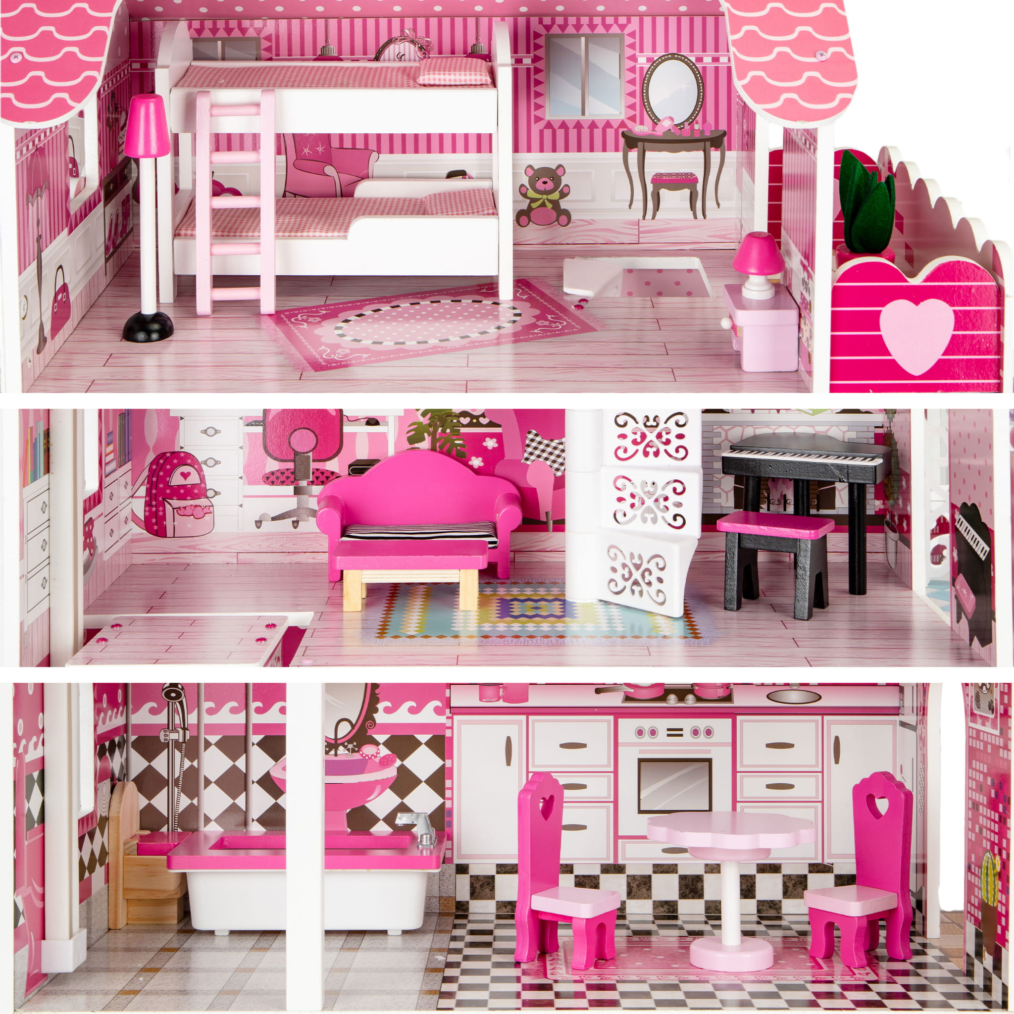Drewniany domek dla lalek marki ECOTOYS to idealna propozycja dla dzieci powyżej 3 roku życia. Ten niezwykle atrakcyjny domek składa się z 3 niezależnych poziomów, które oferują aż 7 różnorodnych pomieszczeń do zabawy. Dzięki zestawowi 16 drewnianych mebelków, dzieci mogą swobodnie aranżować wnętrza według własnych pomysłów. Domek posiada również przestronny taras ze zjeżdżalnią oraz miejsce na grilla, co sprawia, że zabawa staje się jeszcze bardziej wciągająca i kreatywna. Bezpieczna konstrukcja bez ostrych krawędzi zapewnia komfort podczas zabawy, a różnorodność stylistyki pomieszczeń rozwija wyobraźnię i zdolności manualne maluchów. Z pewnością stanie się on ulubionym miejscem do zabawy, gdzie dzieci mogą tworzyć własne historie i spędzać czas w towarzystwie przyjaciół.
