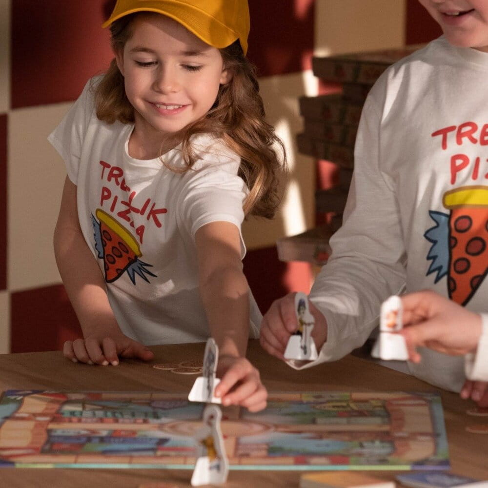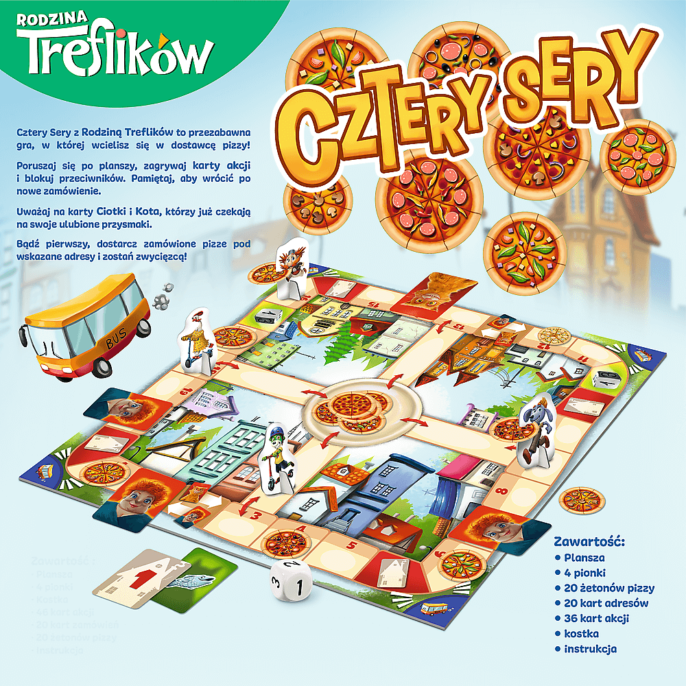 Rodzina Treflików Cztery Sery to przezabawna gra planszowa, która dostarczy wiele radości całej rodzinie. Przeznaczona dla dzieci od 5. roku życia, gra pozwala na wcielenie się w ulubionych bohaterów z bajki Rodzina Treflików. Gracze stają się dostawcami pizzy, poruszając się po kolorowej planszy i zagrywając karty akcji. Wyjątkowym wyzwaniem są karty Ciotki i Kota, które potrafią skutecznie utrudnić rozgrywkę. Celem jest dostarczenie 4 pizz i pokonanie przeciwników. Gra jest idealna na wspólne spędzanie czasu, a średni czas rozgrywki wynosi 20 minut. Dzięki solidnemu wykonaniu i bajkowym ilustracjom, gra zapewnia długotrwałą rozrywkę. To doskonały sposób na rozwijanie relacji rodzinnych i wspólne przeżywanie emocji.