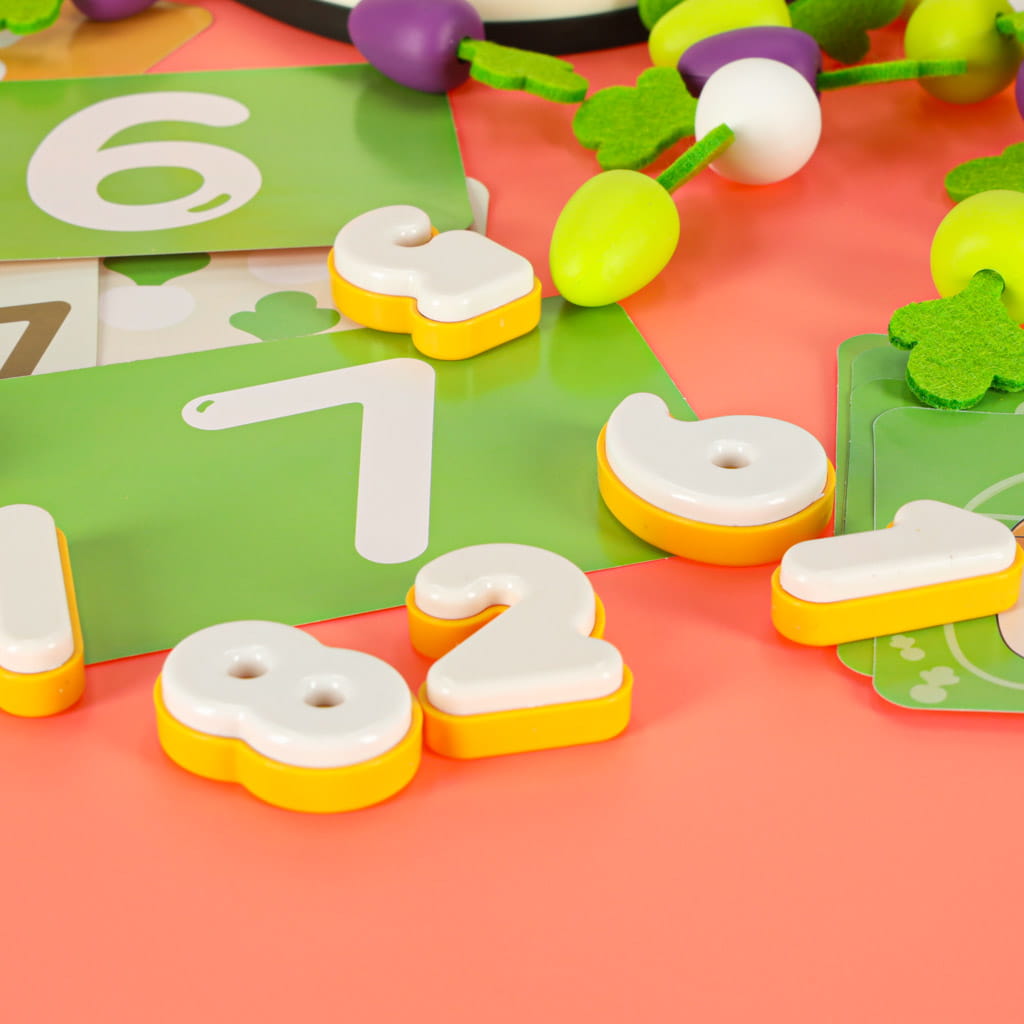 - Uczy rozpoznawania kolorów i podstawowych zasad liczenia