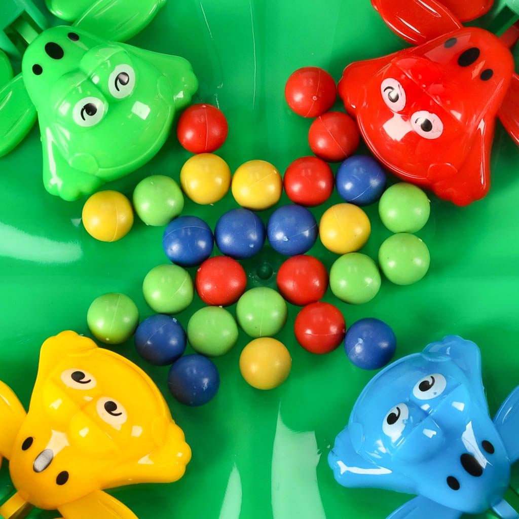 GRA ZRĘCZNOŚCIOWA SKACZĄCE ŻABKI ŻABY 4 GRACZY Cztery żabki czekają na brzegu jeziora, żeby zacząć wspaniałą zabawę! Prosta gra zręcznościowa dla 2 do 4 graczy zapewni mnóstwo zabawy nie tylko najmłodszym członkom rodziny, ale również rodzicom! A na czym polega zabawa? Jej zasady łatwo zrozumieć - każdy z graczy wybiera jedną żabkę, następnie musicie wsypać kulki na środek planszy i wciskając listki spróbować złapać ich jak najwięcej! Gdy wszystkie kulki zostaną zebrane, podliczcie je - wygrywa osoba z ich największą ilością. Zwycięstwo będzie wymagać odpowiedniej strategii i zręczności, więc opanowanie odpowiedniej techniki może zająć trochę czasu! Zapewni to mnóstwo satysfakcji po każdej udanej rundzie, a także pozwoli rozwinąć szereg zdolności manualnych i intelektualnych! Wspólne granie wspaniale wpłynie na wasze relacje rodzinne, a dzieci nauczą się jak zdrowo rywalizować, a także jak zachować się w wypadku wygranej lub przegranej! Dzięki temu łatwiej będzie im znosić życiowe sukcesy i nieuniknione porażki! Prosta konstrukcja pozwoli cieszyć się zabawką przez długi czas! Im mniej elementów, tym mniejsza szansa, że coś ulegnie uszkodzeniu! Dodatkowo, wytrzymałe materiały zapewnią świetną trwałość! Skaczące żabki to wyjątkowa zabawa dla całej rodziny!