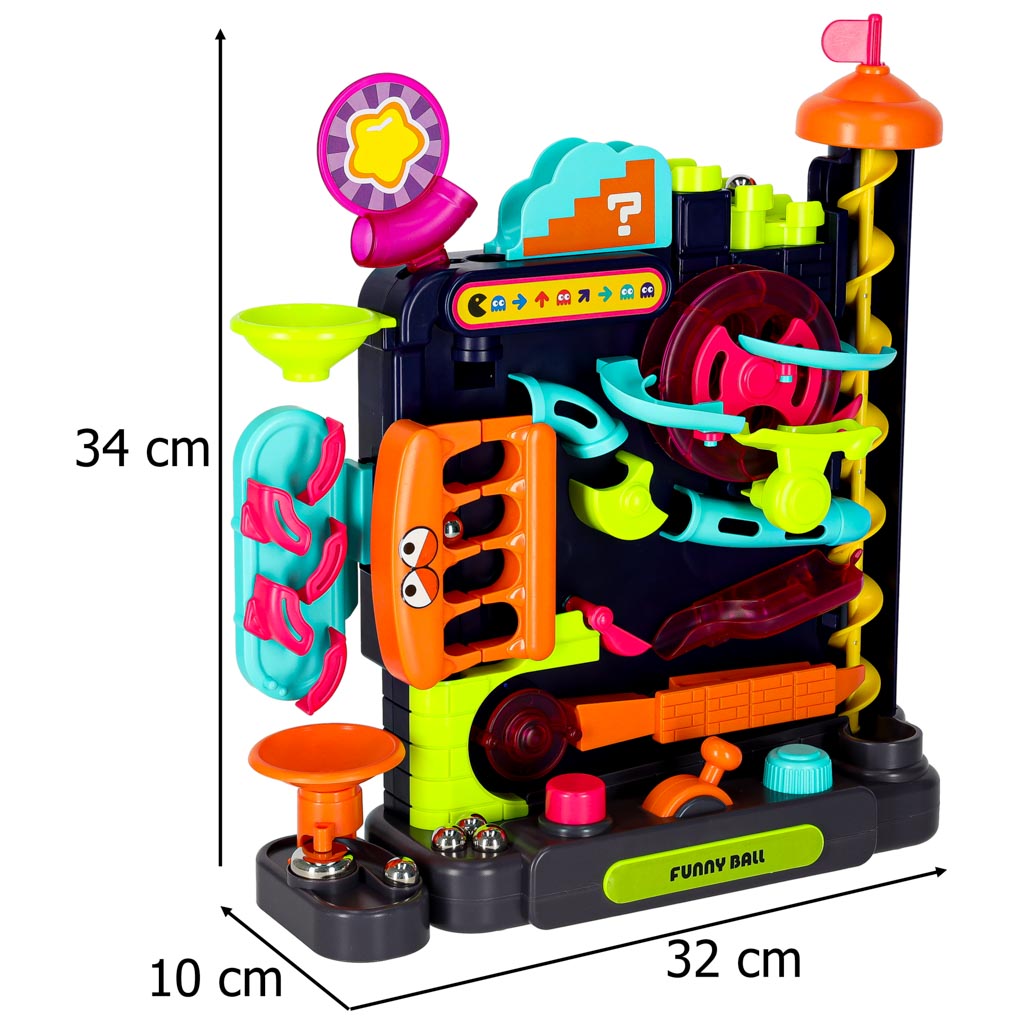 Zabawka zręcznościowa kulkowy tor przeszkód Kulkowy tor przeszkód STEM to doskonały trening logicznego myślenia. Aby popchnąć kulki do przodu, trzeba opracować odpowiednią strategię działania. Łączy eksperyment naukowy z zabawą – kulki poruszają się pod wpływem grawitacji na bazie ułożenia toru. To wciągająca zabawa na długie godziny, która ćwiczy koncentrację oraz uważność. Kulkowy tor przeszkód rozwija umiejętności motoryczne oraz uczy logicznego rozwiązywania problemów. Poszczególne elementy planszy reagują na określony ruch pokręteł oraz dźwigni, co pozwala przeprowadzić kulki z jednej strony planszy na drugą. Złożone mechanizmy toru przeszkód angażują zarówno małych, jak i dużych graczy, oferując wiele godzin emocjonującej zabawy.