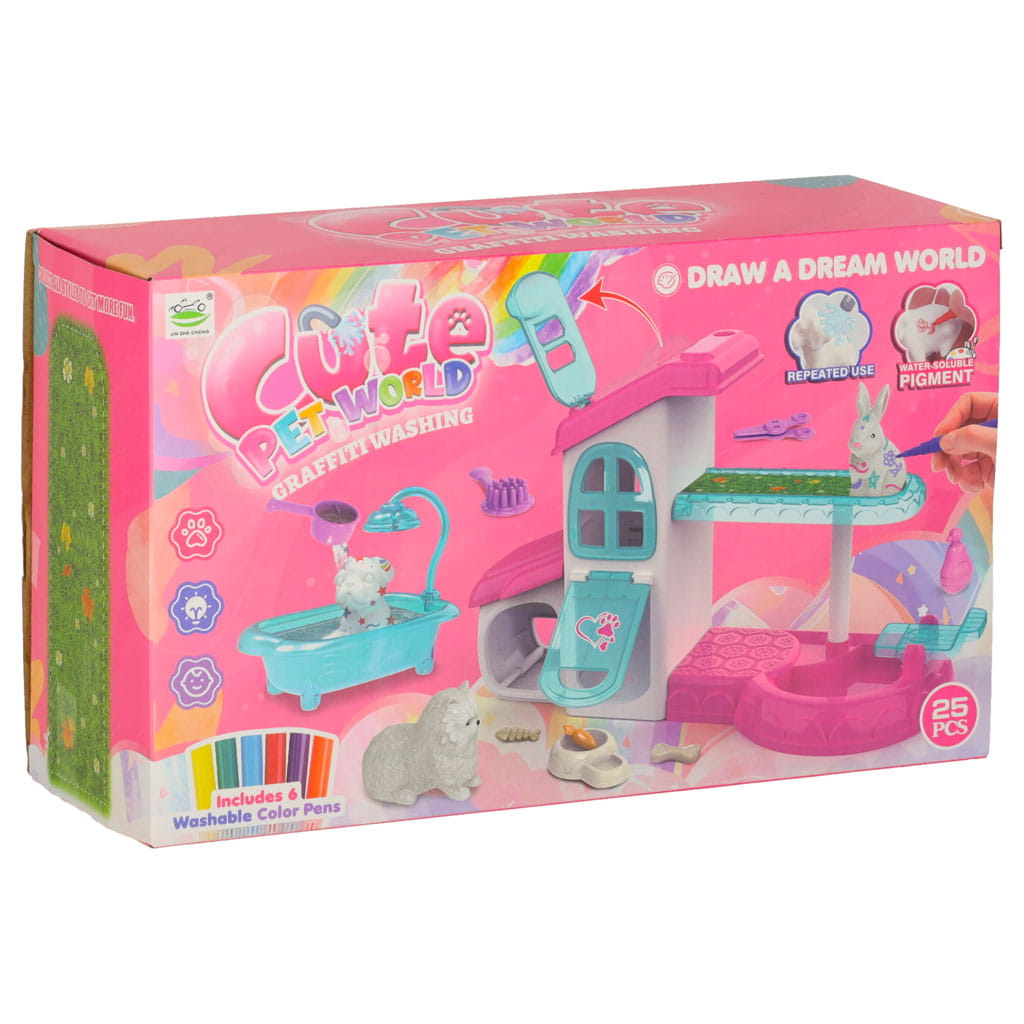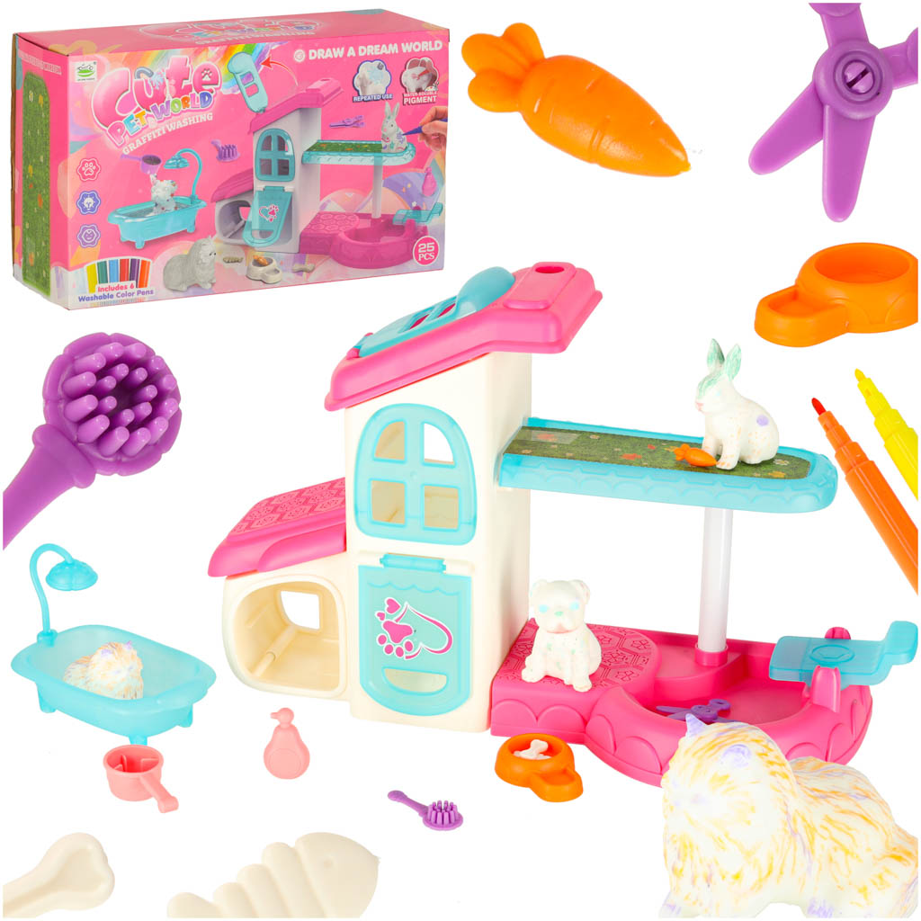 HOTEL SALON PIĘKNOŚCI ZESTAW 26 ELEMENTÓW to idealny wybór dla małych miłośników zwierząt. Ten zabawkowy zestaw SPA dla zwierząt rozwija kreatywność i pozwala dzieciom wcielić się w rolę fryzjera lub właściciela hotelu dla pupili. Dzięki figurkom zwierzątek, które można malować zmywalnymi mazakami, dzieci uczą się empatii oraz troski o innych. Zestaw w stylistyce hotelu ze SPA z pewnością przypadnie do gustu kreatywnym maluchom. W skład zestawu wchodzi domek z otwieraną klapką, basenem i tarasem, co dodatkowo uatrakcyjnia zabawę. Pupile mogą korzystać z kąpieli w wanience oraz z pielęgnacji ich futerka. Możliwość przygotowania ulubionych smakołyków sprawia, że zabawa staje się jeszcze przyjemniejsza. Ten zestaw to znakomita okazja do nauki i zabawy w jednym!