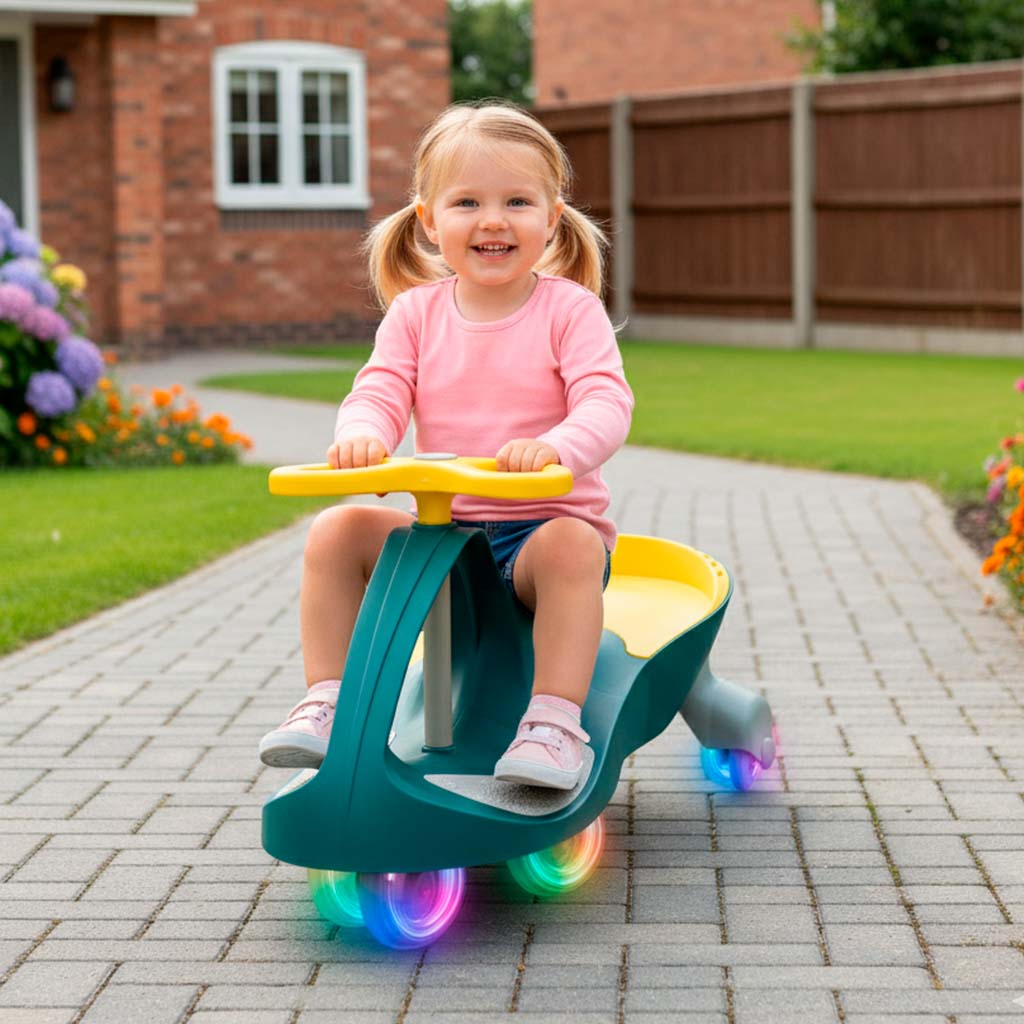 JEŹDZIK GRAWITACYJNY ŚWIECĄCE KOŁA LED ZIELONO-ŻÓŁTY to niesamowity produkt, który zapewnia dziecku wiele radości i zabawy! Dzięki innowacyjnej konstrukcji, maluch może poruszać się samodzielnie, wykorzystując jedynie ruchy kierownicą. Taki sposób jazdy nie tylko rozwija zdolności motoryczne, ale także sprawia, że zabawa staje się jeszcze bardziej ekscytująca. Wygodne, wyprofilowane siedzenie zapewnia komfort, a antypoślizgowe nakładki na nóżki gwarantują bezpieczeństwo podczas zabawy. Szerokość kierownicy została starannie dobrana, aby idealnie pasowała do małych rączek. Świecące kółka LED z pewnością przyciągną uwagę każdego malucha, a kauczukowe kółka chronią podłogę przed zarysowaniami. Dzięki szeroko rozstawionym tylnym kółkom, jeździk jest stabilny i bezpieczny, a maksymalne obciążenie wynoszące 80 kg sprawia, że może być używany przez dłuższy czas. To idealny wybór dla każdego dziecka!