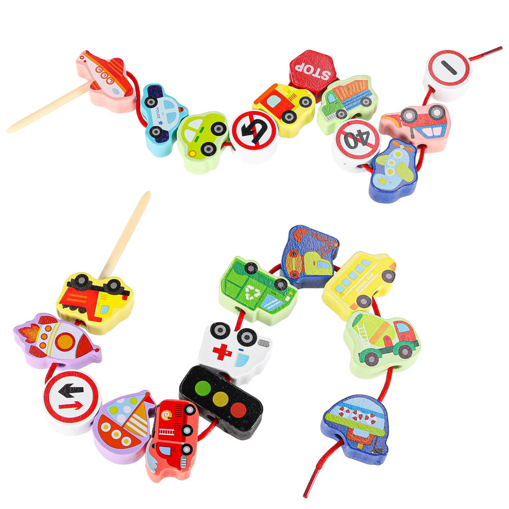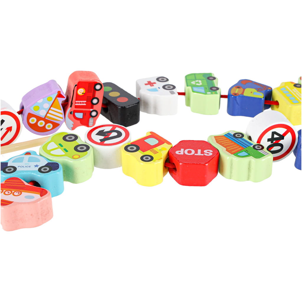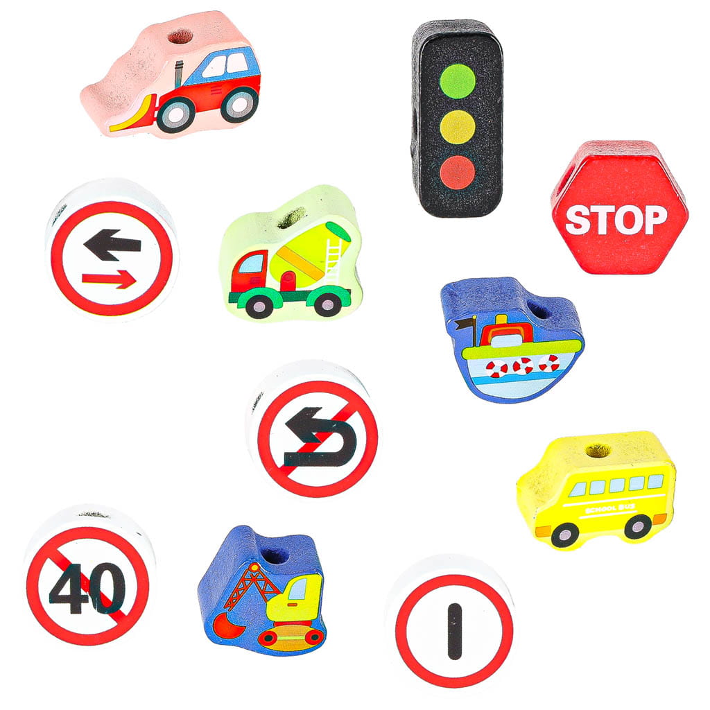 Klocki drewniane do nawlekania pojazdy znaki drogowe