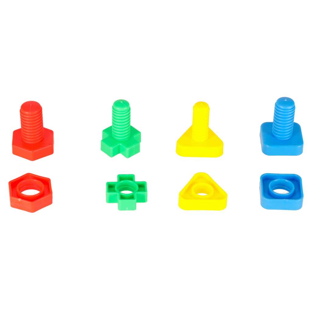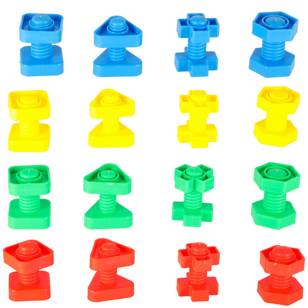 KLOCKI KONSTRUKCYJNE ŚRUBY to fantastyczny zestaw kolorowych klocków w kształcie śrub. Doskonała zabawka edukacyjna, która przeniesie mnóstwo radości i zabawy. Świetnie sprawdzi się jako zabawka typu „dopasuj kształty”. Zabawa polega na wkręcaniu śrub do odpowiednich nakrętek. Znakomita zabawka, która pozytywnie wpływa na rozwój logicznego myślenia i zdolności manualnych dziecka. Co więcej, zabawa klockami kształtuje wyobraźnię przestrzenną malucha i wspomaga rozwój koordynacji wzrokowo-ruchowej. Pomocna podczas nauki nazw kolorów i kształtów, żywa nasycona kolorystka zachęci każdego malucha do zabawy. W skład zestawu wchodzi 30 elementów: 15 śrub i 15 nakrętek na śruby.