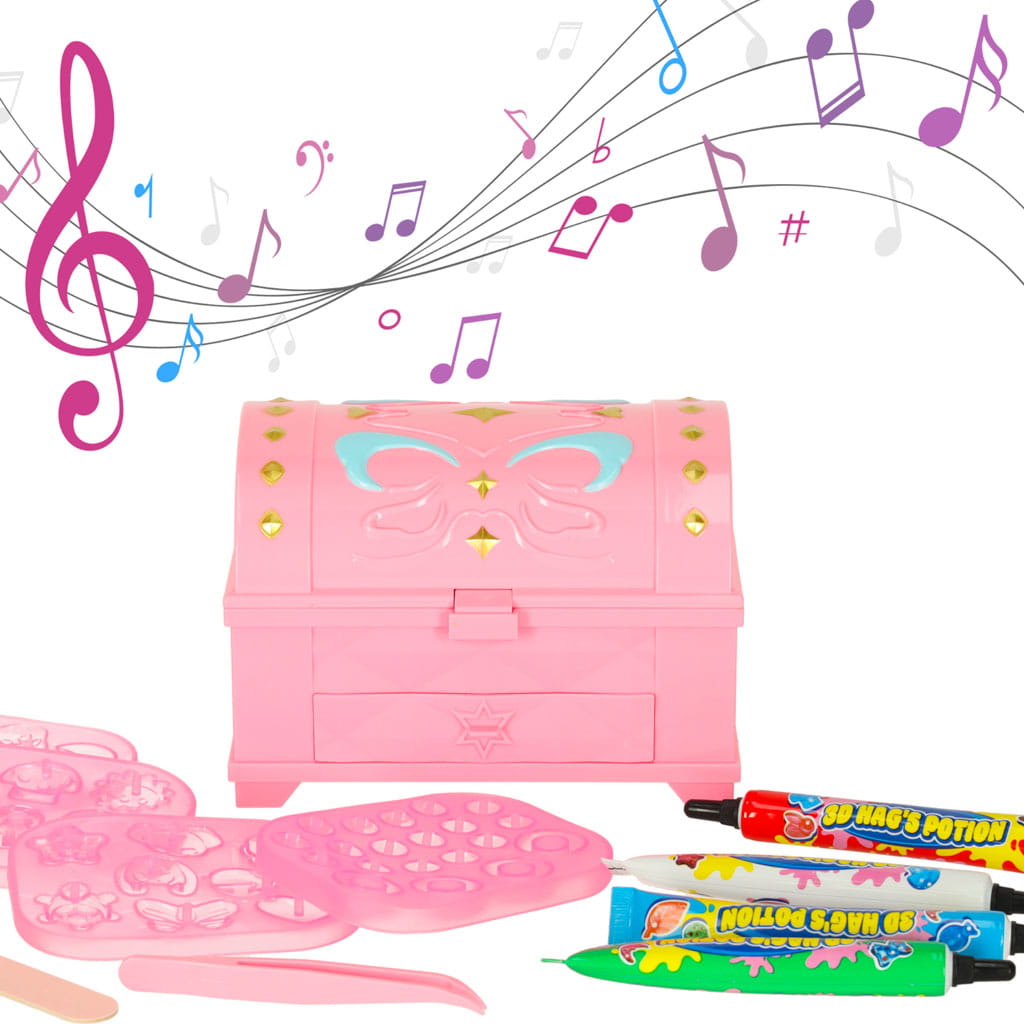 „Magiczne Pudełko” to kreatywny zestaw, który pozwala dziecku stworzyć własną biżuterię z kolorowego kleju, rozwijając przy tym zdolności manualne, kreatywność i poczucie estetyki. Zestaw zawiera cztery tubki kleju w różnych kolorach oraz foremki o unikalnych kształtach, co sprawia, że każda stworzona biżuteria jest wyjątkowa. Proces tworzenia jest prosty i przyjemny, a utwardzanie biżuterii zajmuje zaledwie 90 sekund dzięki innowacyjnej skrzynce UV. Dodatkowe elementy, takie jak brokat i małe kryształki, umożliwiają jeszcze bardziej fantazyjne ozdabianie. Akcesoria, takie jak pilnik i pęseta, ułatwiają pracę, a wesoła melodia umila czas tworzenia. Skrzynka jest również wyposażona w lusterko i szufladkę na akcesoria, co czyni ją funkcjonalnym narzędziem do kreatywnej zabawy.