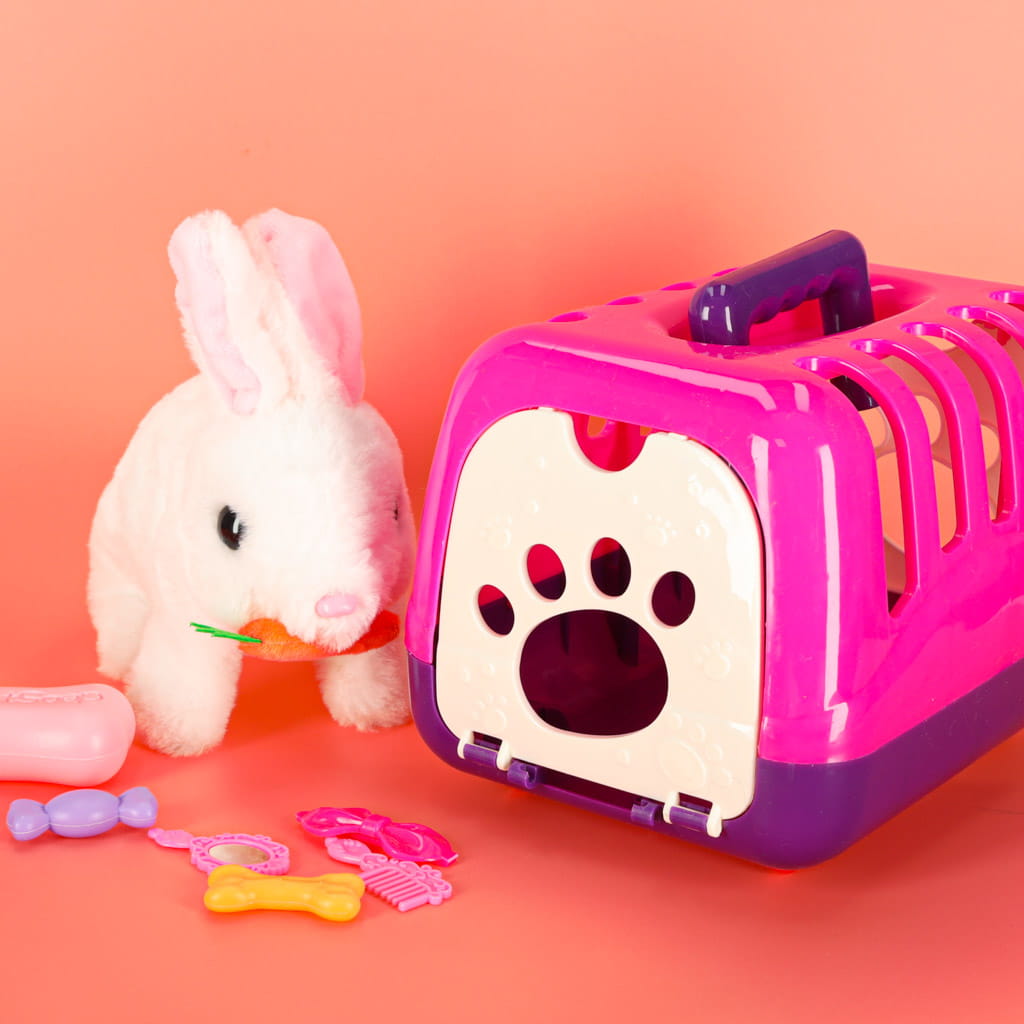 INTERAKTYWNY KRÓLIK - PLUSZAK KRÓLICZEK ZABAWKA, KTÓRA UCZY, WZRUSZA I ZACHWYCA. W świecie dziecięcych marzeń pojawił się nowy bohater - interaktywny króliczek, który nie tylko zachwyca wyglądem, ale i angażuje wszystkie zmysły dziecka. To nie jest zwykła pluszowa maskotka. Króliczek chodzi, wydaje dźwięki, rusza uszami i porusza noskiem, jakby naprawdę chrupał marchewkę. Dzięki interaktywnym funkcjom, króliczek staje się wiernym towarzyszem zabaw, przyjacielem i pierwszym pupilem dziecka. Wspiera rozwój emocjonalny, uczy czułości i odpowiedzialności, a jednocześnie sprawia, że każde popołudnie zmienia się w magiczną przygodę. Zestaw z transporterem to ogromna frajda i poczucie odpowiedzialności w jednym. Dodatkowo zestaw zawiera całą gamę uroczych akcesoriów do pielęgnacji króliczka, co rozwija kreatywność i wyobraźnię. To idealny prezent, który zostaje w sercu.