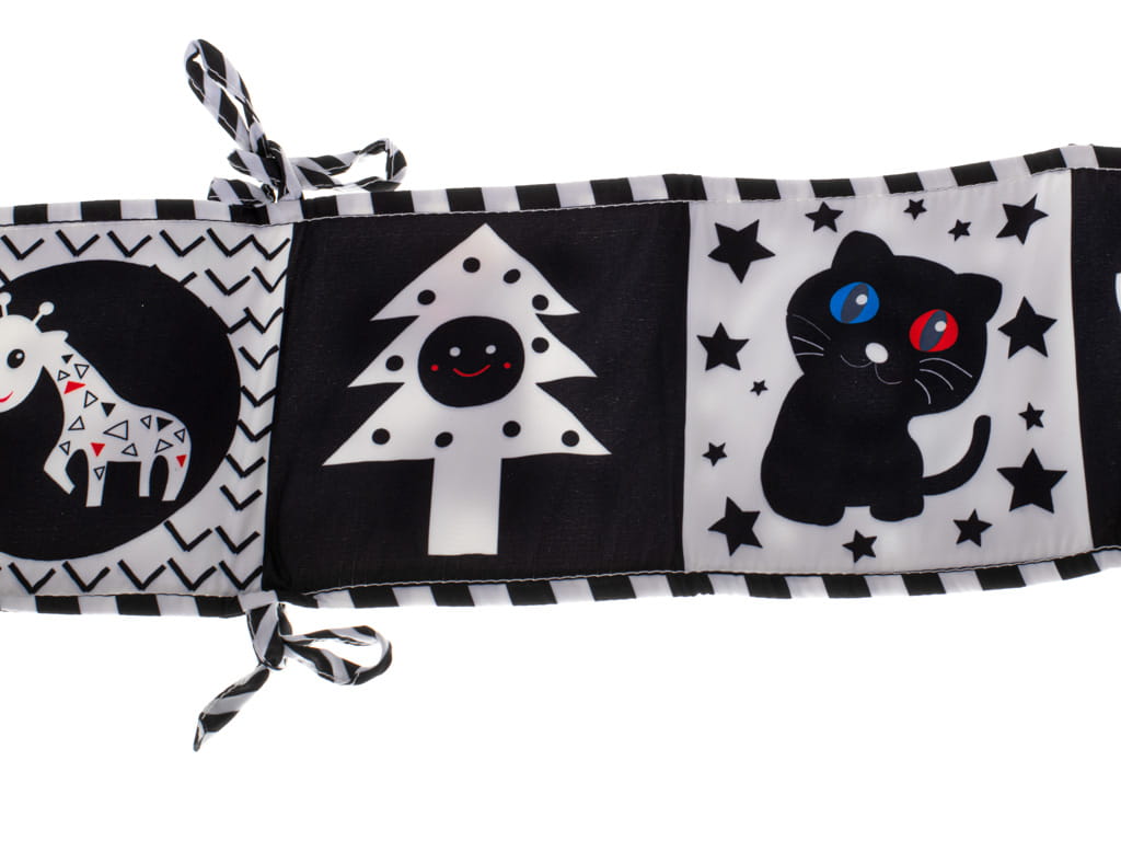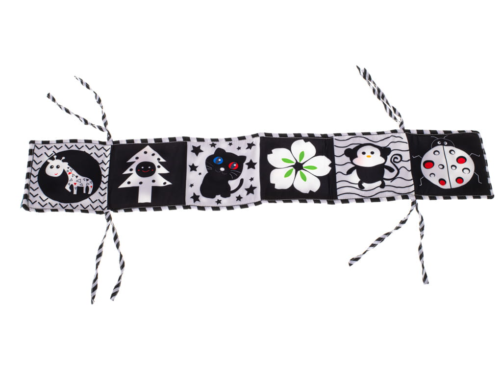 Książeczka edukacyjna ochraniacz na łóżeczko biedronka to pierwsza lektura Twojego dziecka! Zabierz malucha w magiczną podróż po świecie różnych kształtów. Magiczna materiałowa książeczka w kontrastowe wzory to świetna propozycja dla dzieci dopiero poznających świat. Książeczka w kształcie harmonijki świetnie sprawdzi się w roli maty ochronnej do łóżeczka. Za pomocą sznureczków przymocujesz ją do szczebelków, co zapewni bezpieczeństwo podczas zabawy. Wykonana z dbałością o każdy szczegół, książeczka jest pełna niespodzianek, które pobudzą ciekawość malucha. Znajdziesz w niej strony o różnych fakturach i właściwościach, takie jak szeleszczące strony i kontrastowe wzory, które zadbają o harmonijny rozwój Twojej pociechy. Już od pierwszych chwil życia dziecka istotną rolę w jego prawidłowym rozwoju odgrywa stymulowanie zmysłów. Poprzez zabawę książeczką-matą maluch będzie ćwiczył akomodację oka oraz rozwijał koordynację wzrokowo-ruchową.