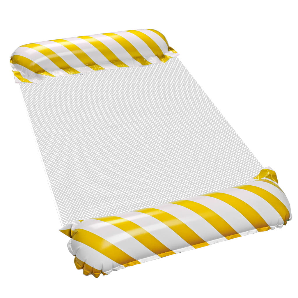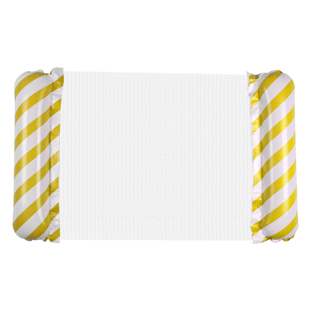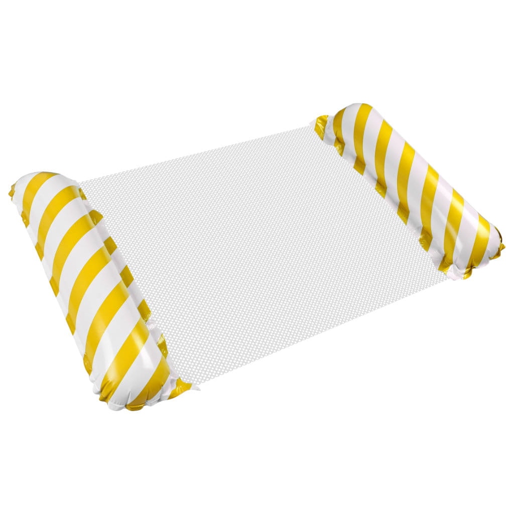 Żółty dmuchany materac plażowy do pływania na wodzie wyróżnia stabilność – dmuchane oparcia wzmocnione materiałową siatką pozwalają luźno unosić się na wodzie. Ciekawe połączenie kolorów – biało-żółte paski na materacu wprowadzają do otoczenia beztroski klimat wakacji. Niewielka pojemność po złożeniu sprawia, że pływający leżak wejdzie bez problemu do walizki lub bagażnika samochodu. Biało-żółty materac do pływania jest stworzony do wypoczynku na plaży oraz na basenie. Dmuchane boki zapewniają odpowiedni balans, a mocna siateczka utrzymuje ciało na wodzie. Wygodny leżak czy pływający fotel? Ten materac jest przystosowany do zróżnicowanych form spędzania czasu. Unosząc się na wodzie, można w pełni doświadczyć relaksu w otoczeniu wody i letniego słońca.