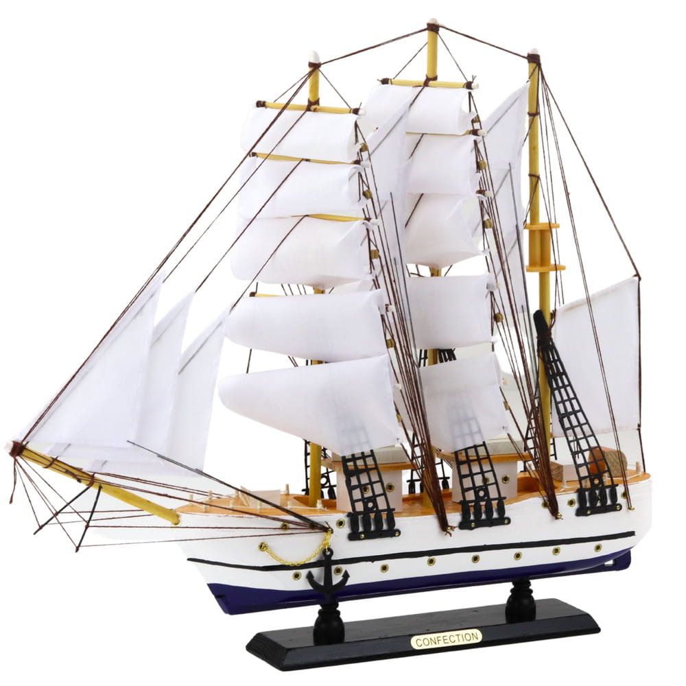 Model żaglowca typu fregata to imponująca replika historycznego statku z epoki wielkich odkryć morskich. Charakteryzuje się wysokim poziomem detali, wielomasztową konstrukcją, rozwiniętymi żaglami oraz finezyjnie wykonanymi olinowaniami. Jego klasyczna forma z XVIII–XIX wieku przywodzi na myśl dawne morskie podróże, flotyllowe ekspedycje i bitwy na otwartym oceanie. Ten elegancki żaglowiec stanowi doskonałe połączenie rzemiosła modelarskiego i ponadczasowej estetyki inspirowanej historią żeglugi. Model wykonano z dbałością o każdy detal – od drewnianego pokładu, przez malowane burty, aż po ręcznie naciągnięte liny i rozwinięte żagle z tkaniny. Statek osadzono na solidnej, czarnej podstawce z nazwą „Confection”, która podkreśla jego ekspozycyjny charakter. Doskonale prezentuje się jako dekoracja w salonie, gabinecie, bibliotece czy biurze – nadając wnętrzu charakteru, prestiżu i elegancji w stylu marynistycznym.