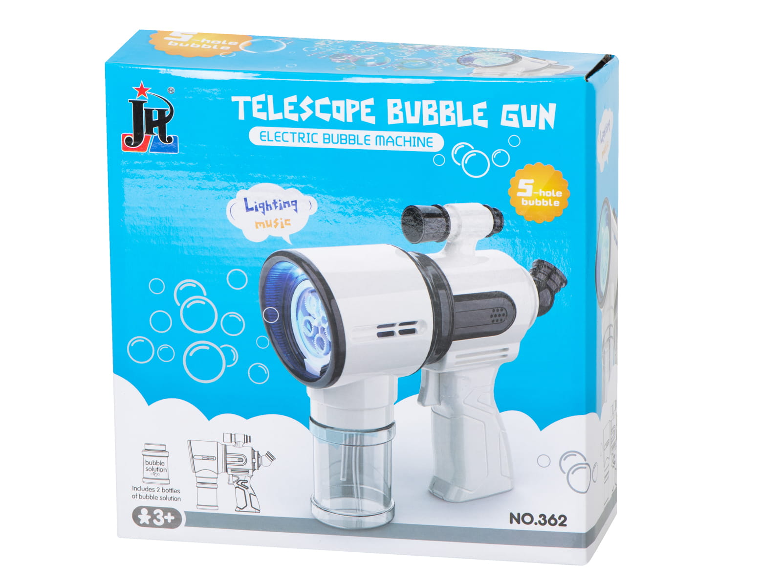 PISTOLET GENERATOR DO ROBIENIA BANIEK MYDLANYCH Kolorowe bańki mydlane są nieodłącznym elementem każdego dzieciństwa. Każdy maluch kocha tęczowe bąbelki mydlane, a jeszcze bardziej uwielbia je wytwarzać. Kosmiczny pistolet strzelający bańkami przypominający lunetę przeniesie dziecko w magiczny świat niekończącej się zabawy. Zabawka została wyposażona w 5 pierścieni, które podczas przyciskania spustu zanurzają się w płynie, a mały wiatraczek powodujący delikatny podmuch sprawia, że wylatują setki kolorowych bąbelków mydlanych. Zabawę urozmaicą dodatkowe efekty świetlne i dźwiękowe, które w zależności od potrzeb można wyłączyć lub włączyć przy pomocy przycisku umieszczonego z tyłu zabawki. Tęczowe bańki unoszące się w powietrzu uczynią świat piękniejszym i sprawią wiele radości dziecku. Pistolet na bańki to propozycja wciągającej, kreatywnej zabawy wspierającej prawidłowy rozwój pociechy.