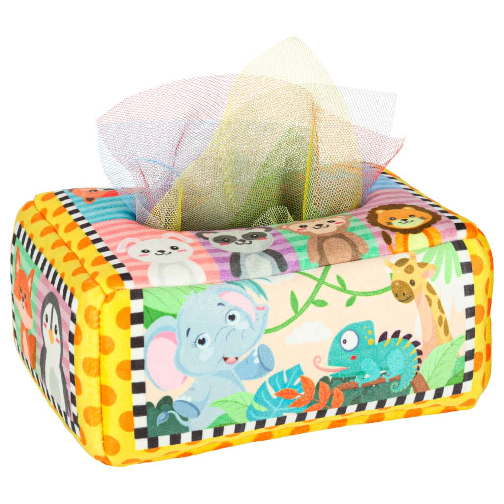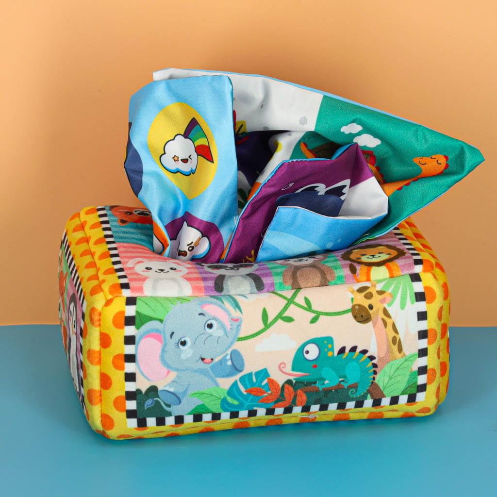 SORTER MONTESSORI PUDEŁKO Z CHUSTECZKAMI ZWIERZĄTKA to idealny wybór dla maluszka! Wspiera rozwój i bawi jednocześnie. Szukasz zabawki, która zachwyci Twoje dziecko, a jednocześnie zadba o jego rozwój motoryczny i zmysłowy? Ten uroczy sorter Montessori w formie miękkiego pudełka z kolorowymi chusteczkami i wzorzystymi tkaninami to strzał w dziesiątkę! Produkt został zaprojektowany z myślą o najmłodszych - bezpieczny, wytrzymały i łatwy w utrzymaniu czystości. Zabawka doskonale wpływa na rozwój ruchu u dziecka, uczy chwytania, trzymania i wyciągania przedmiotów z pudełka - wszystko to wspiera rozwój motoryki małej. Zestaw zawiera 8 przezroczystych, kolorowych chusteczek oraz 3 tkaniny z różnymi wzorami, które pobudzają wzrok i dotyk dziecka, rozwijając jego percepcję sensoryczną. Dodatkowo, szeleszcząca folia sensoryczna w pudełku wydaje delikatny dźwięk, co pobudza ciekawość dziecka i wspiera rozwój zmysłu słuchu.