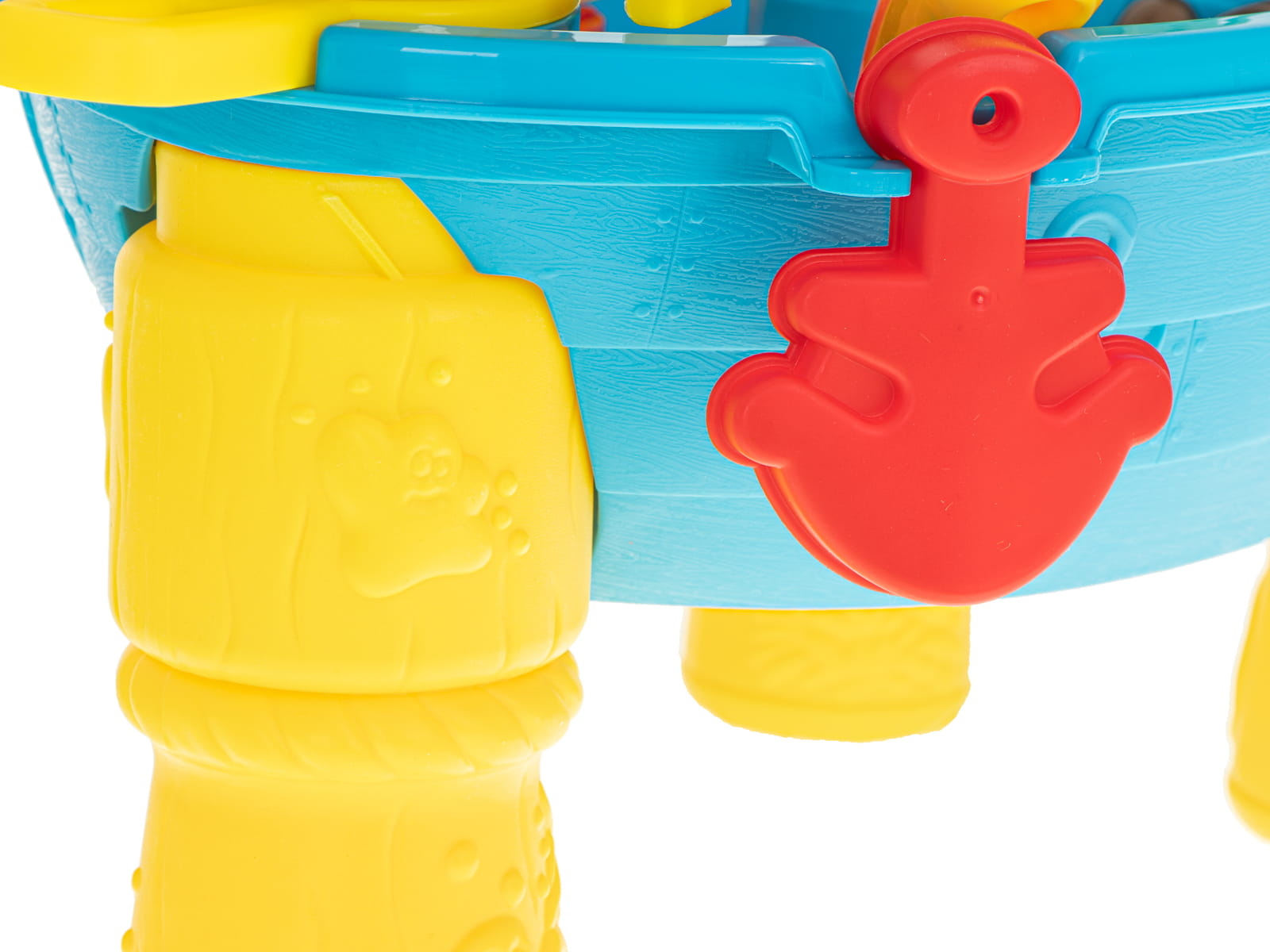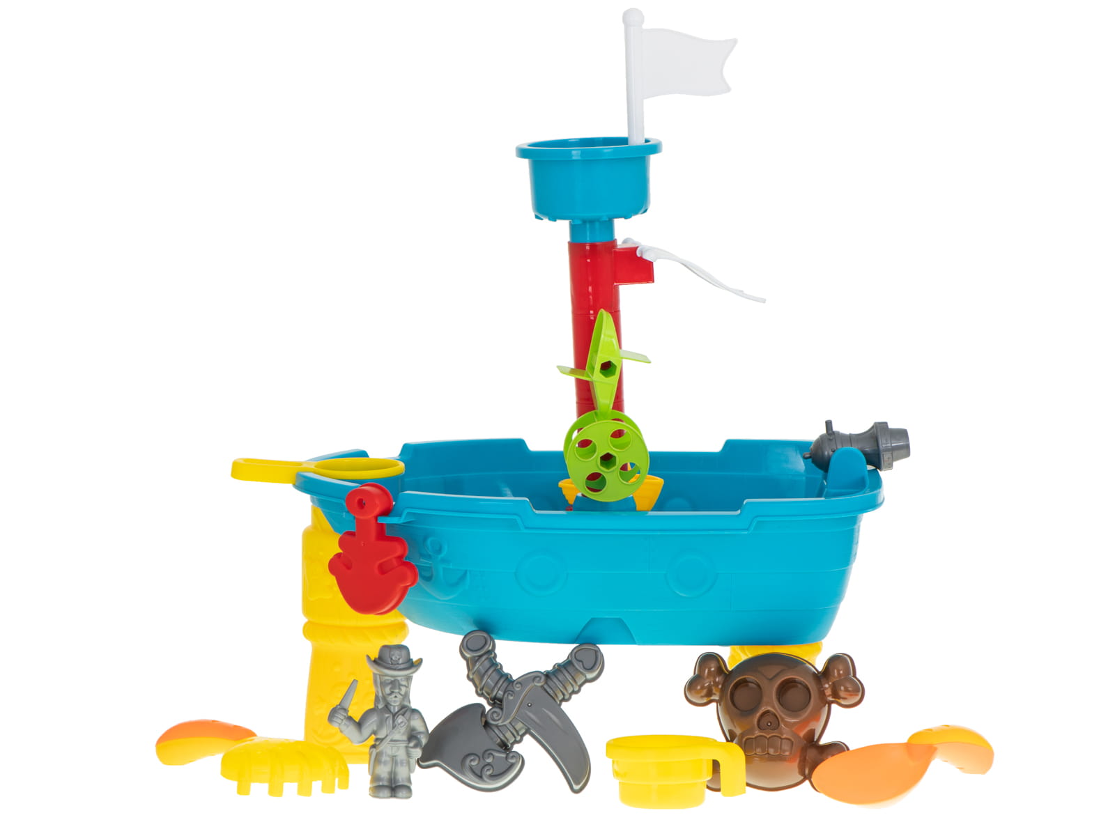STOLIK WODNY PIASKOWNICA STATEK PIRACKI Ahoj piracie! Czas na przygodę! Piracki statek wypływa na szerokie wody wyobraźni. Pokochają go dziewczynki i chłopcy. Każdy maluch, który uwielbia opowieści o piratach, będzie zachwycony! Dodatkowe akcesoria sprawiają, że zwykła zabawa „w piaskownicy” zamienia się w niesamowitą piracką przygodę! Arr! Wyrusz w podróż pełną świetnej zabawy. Łódka dostarczy maluchowi mnóstwa wrażeń. Kolorową piaskownicę w kształcie statku można wypełnić wodą, piaskiem czy paskiem kinetycznym (w tym przypadku sprawdzi się również w pomieszczeniach). Zbuduj niesamowite piaskowe konstrukcje z wykorzystaniem dołączonych foremek, kubeczka, łopatki i grabek. Chlap do woli! Nalej wody do bocianiego gniazda i przekonaj się, jak fontanna napędza dwa młynki. Zabierz łódkę do basenu lub innego zbiornika wodnego i pozwól jej dryfować wśród prawdziwych fal. Zabawa na sucho? Zbierz załogę najbardziej wytrwałych lalek, figurek oraz przytulanek i wyruszcie w poszukiwaniu ukrytych skarbów. Na pokładzie nie zabrakło armaty, którą będziecie odpierać atak nieprzyjaciela. Zabawa bez brudzenia się jest możliwa i równie ekscytująca. Ahoj!