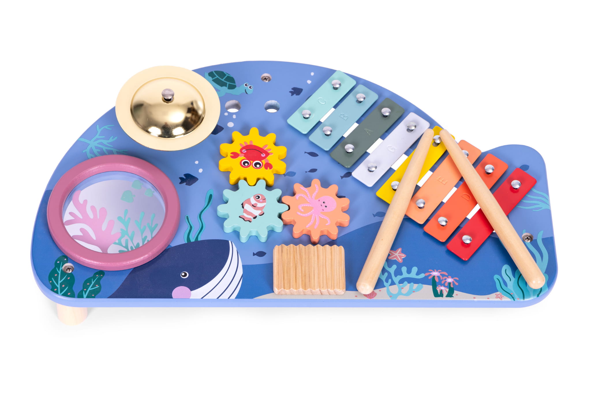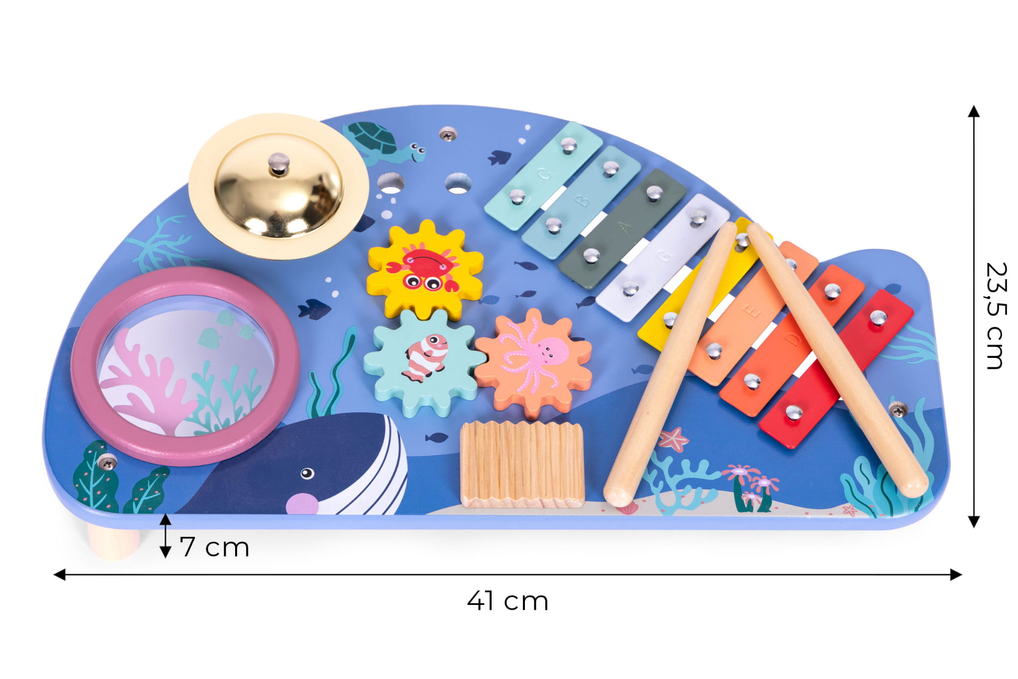 Drewniany stoliczek z instrumentami to idealna zabawka dla małych miłośników muzyki, przeznaczona dla dzieci powyżej 18 miesiąca życia. Jego atrakcyjny kształt wieloryba przyciąga uwagę maluchów, a bezpieczna konstrukcja pozbawiona ostrych krawędzi zapewnia komfort zabawy. W zestawie znajdują się cztery instrumenty: bębenek, talerz, cymbałki oraz tarka, które rozweselą każde dziecko. Ruchome koła zębate dodatkowo zachęcają do zabawy, a dwie drewniane pałeczki do grania umożliwiają tworzenie własnych melodii. Zabawka rozwija zdolności manualne, kreatywność oraz wyczucie rytmu, co czyni ją doskonałym narzędziem do nauki muzyki. Stoliczek nie tylko dostarcza radości, ale także wspiera rozwój motoryki oraz koordynacji ręka-oko. To wspaniały pomysł na prezent, który z pewnością ucieszy każde dziecko.