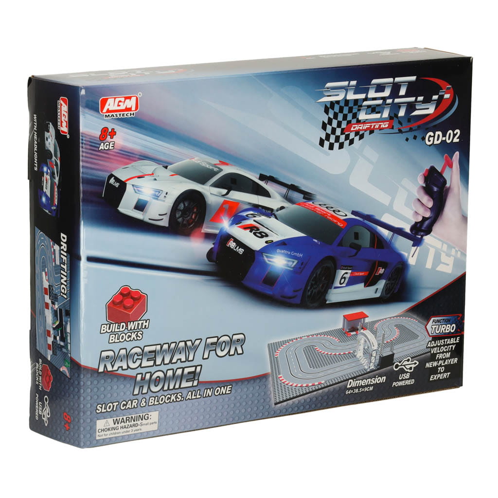 Tor wyścigowy samochodowy elektryczny policyjny 2 auta autka kontrolery zakręty klocki konstrukcyjne GD-02