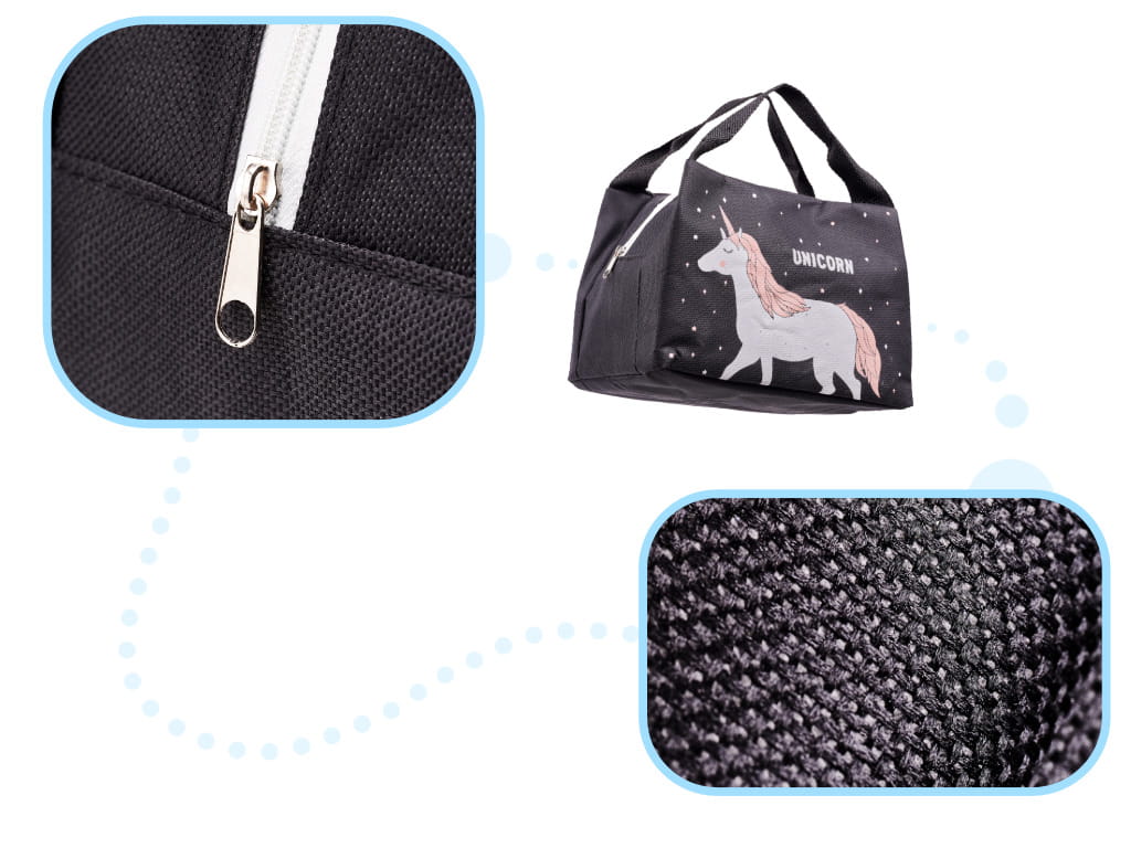 TORBA TERMICZNA IZOLACYJNA ŚNIADANIE LUNCH JEDNOROŻEC to praktyczna torba, która łączy nowoczesny styl z funkcjonalnością. Idealnie sprawdzi się w różnych sytuacjach, takich jak szkoła, praca, piknik, plaża czy podróż. Dzięki niej nie musisz się martwić, co spakować na drugie śniadanie, ponieważ zawsze będziesz miał małe co nieco pod ręką. Wykonana z dbałością o każdy detal, z wytrzymałego materiału, torba posiada jedną komorę zapinaną na zamek błyskawiczny, co ułatwia dostęp do zawartości. Bez problemu zmieścisz w niej kanapkę, pudełko z ciepłym posiłkiem oraz mały termos. Jest lekka i poręczna, a wygodne uchwyty umożliwiają noszenie jej w dłoni lub zawieszenie na wieszaku. Gdy nie będzie już potrzebna, możesz ją złożyć i schować do plecaka lub torebki. Wewnątrz znajduje się warstwa folii termoizolacyjnej, która utrzymuje jedzenie w odpowiedniej temperaturze i świeżości przez dłuższy czas. Torba jest idealna zarówno dla dzieci, jak i dorosłych, a jej nowoczesny design z pewnością przyciągnie uwagę. Dodatkowo, jest łatwa w czyszczeniu – wystarczy przetrzeć ją wilgotną ściereczką lub uprać w letniej wodzie z delikatnym płynem do prania.