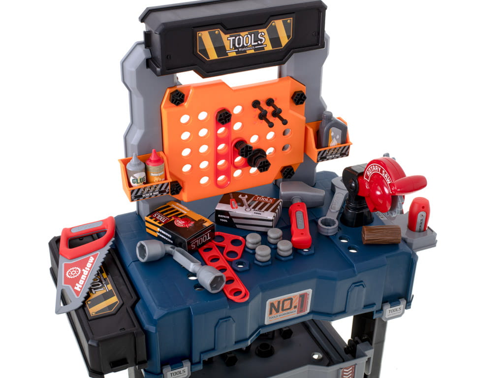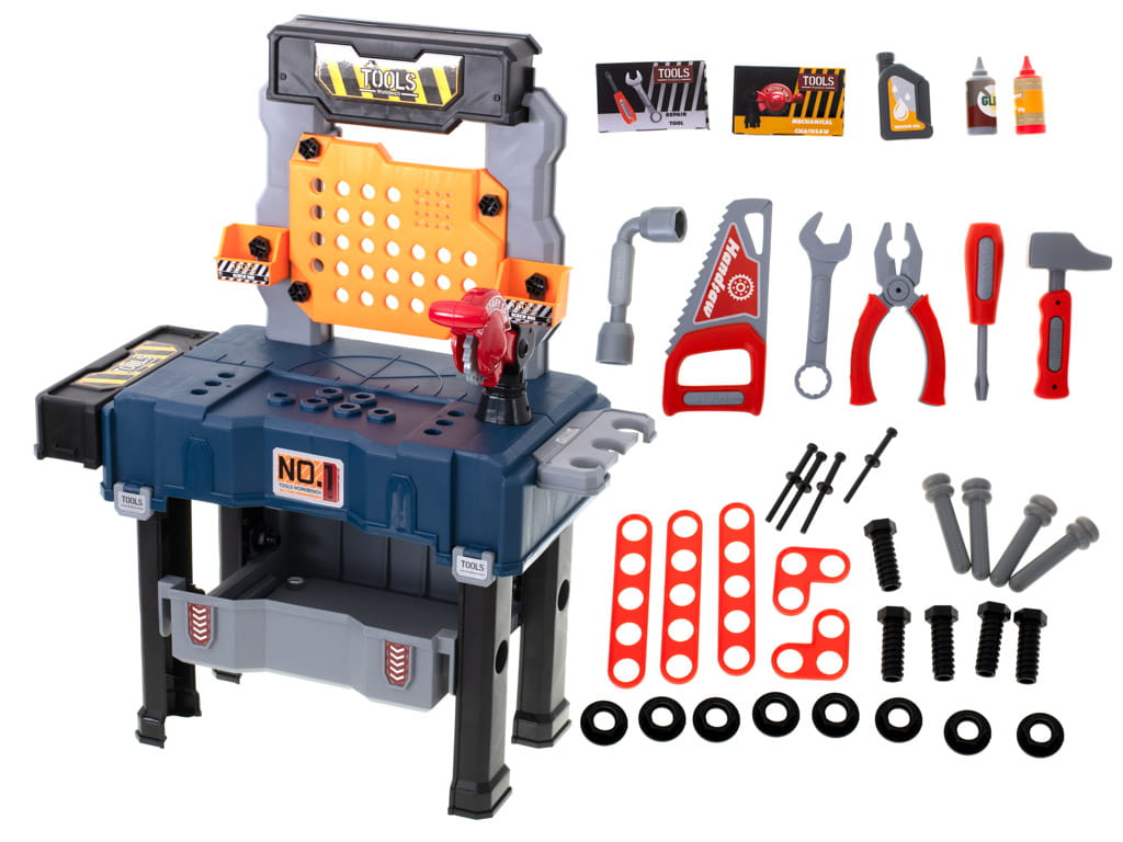 WARSZAT ZESTAW MAJSTERKOWICZA STOLIK + NARZĘDZIA 65EL. Czy Twoją pociechę ciągnie do pomocy przy remontowych sprawach? A może zawsze bawi się w dokręcanie śrubek? Od dziś będzie miało swój własny zestaw, przy którym będzie mogło czynnie majsterkować. Cały zestaw jest zapakowany w walizkę, do złudzenia przypominającą prawdziwą walizkę doświadczonego majstra. Walizka przekształca się w łatwy sposób w stolik, który posiada wiele różnych zakamarków do przechowywania rzeczy: duża dolna skrzynia na większe części, ściana perforowana, dwie półeczki, chwytak na akcesoria, oraz dużą przestrzeń na blacie. Nawet samo zbudowanie stolika wprawia dziecko w tryb majsterkowania. W zestawie jest ogrom akcesoriów, które będą pomocne przy każdej zabawie w majsterkowicza. Nauczą dzieci również podstaw majsterkowania. I kto wie, może wywiąże się z tego pasja na lata! Zabawa zestawem doskonale wpływa na umiejętności manualne dzieci. Każdy z przyrządów wymaga innego ruchu ciała. Wbijanie gwoździ, przykręcanie śrubek, piłowanie drewna – wszystko jest do opanowania. Rozwija kreatywne myślenie i pobudza wyobraźnię, może również zachęcić dzieci do tworzenia rzeczy w idei DIY (zrób to sam). Zestaw zachęca do tworzenia różnych scenariuszy zabawy. Mały remont domu? A może własny warsztat do którego przychodzą klienci? Naprawa sprzętów? Jedynym ograniczeniem jest Wasza wyobraźnia – majsterkujcie i naprawiajcie do woli!