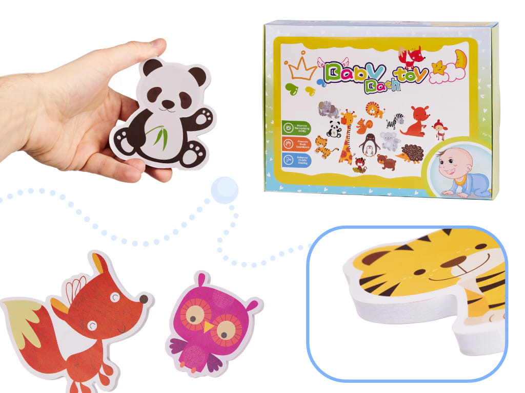 ZABAWKA DO KĄPIELI PUZZLE PIANKOWE ZWIERZĄTKA Wodne zoo? Brzmi fantastycznie! W takim razie do dzieła. Zestaw magicznych puzzli w kształcie zwierzątek to innowacyjna zabawka do kąpieli, która dostarczy dziecku mnóstwo wrażeń. Wszystkie elementy zostały wykonane z miękkiej i trwałej pianki. Nie potrzebujesz kleju, by puzzle trzymały się na wannie lub glazurze. Wystarczy namoczyć je w wodzie. Są bardzo lekkie i wrzuceniu do wanny będą unosić się na wodzie. Szybko schną i są łatwe w przechowywaniu. Puzzle wodne to propozycja doskonałej, niekończącej się zabawy wspierającej prawidłowy rozwój dziecka. Wspaniała zabawka, która dostarczy mnóstwo wrażeń podczas kąpieli. Z pewnością pokocha ją każdy mały odkrywca. Twój maluch nie lubi codziennych kąpieli? Z tym zestawem to przeszłość. Piankowe puzzle przemienią każdą kąpiel w fantastyczną przygodę. Zabawka pobudza kreatywność, pozytywnie wpływa na rozwój logicznego myślenia oraz kształtuje zdolności manualne.