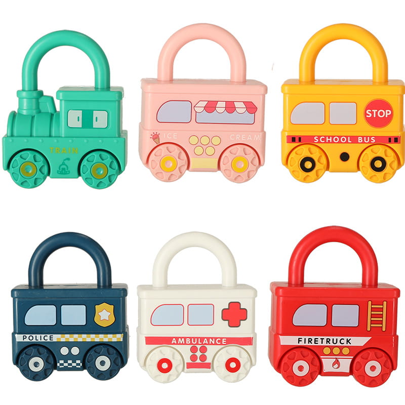 SAMOCHODZIKI KŁÓDKI ZABAWKA SENSORYCZNA MONTESSORI Czy można połączyć zabawę z nauką? Oczywiście, że tak! I tak zabawka jest tego przykładem! Aż sześć uroczych samochodziko-kłódek: lokomotywa, autobus szkolny, radiowóz, straż pożarna, karetka i lodziarnia, które zapewniają wiele możliwości zabawy! Każde z aut jest w innym kolorze, dzięki czemu maluch będzie mógł się nauczyć rozróżniać i nazywać podstawowe kolory. Dodatkowo samochodziki są dwustronne – z jednej strony mają grafikę reprezentującą dany pojazd, a z drugiej napis. Napisy na kłódkach są w języku angielskim, jednak bez obaw nawet jeśli Twój maluch nie zna angielskich nazw albo nie umie czytać, ta zabawka nadal spełni swoje przeznaczenie. Na każdym autku są kółka, które dziecko może policzyć i w taki sposób dopasować odpowiedni kluczyk z arabską liczbą. Maluch może też dopasowywać kluczyki do kłódek poprzez metodę prób i błędów. Zestaw kłódek będzie doskonałym wyzwaniem dla dziecka. Używając podpowiedzi znajdujących się na samochodach oraz na kluczykach, maluch będzie musiał dopasować elementy tak, aby kłódki się otworzyły.