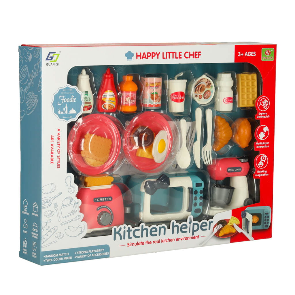 Wspólne gotowanie może być naprawdę świetną rozrywką! Jednak zanim Twój maluch zacznie pomagać Ci w prawdziwej kuchni, dobrze byłoby zapoznać go ze wszystkim podczas zabawy! Duży zestaw, na który składa się mikrofalówka, toster, mikser, a także wiele ciekawych akcesoriów, idealnie się sprawdzi w tej roli! W trakcie wspólnej zabawy wytłumaczysz swojemu dziecku jak bezpiecznie może obsługiwać sprzęty kuchenne! Wiele elementów pozwoli na mnóstwo godzin ciekawej, kreatywnej zabawy! Uroczy design i ciekawe kolory bez wątpienia przyciągną uwagę malucha i zachęcą go do zabawy! Wspólnie upieczecie ciasteczka albo przygotujecie obiad! Toster, mikrofalówka, mikser oraz nóż to narzędzia, które znajdziemy praktycznie w każdej kuchni. Jednakże przy nieodpowiednim korzystaniu mogą one okazać się całkiem niebezpieczne. Warto więc, aby pierwszy kontakt Twojej pociechy z nimi odbył się w kontrolowanych warunkach, czyli podczas zabawy! Zabawa w czynności, które osoby dorosłe wykonują regularnie, jest ważnym elementem prawidłowego rozwoju dziecka. Produkt ten pozwoli Twojemu dziecku na stworzenie własnej, prywatnej kuchni!