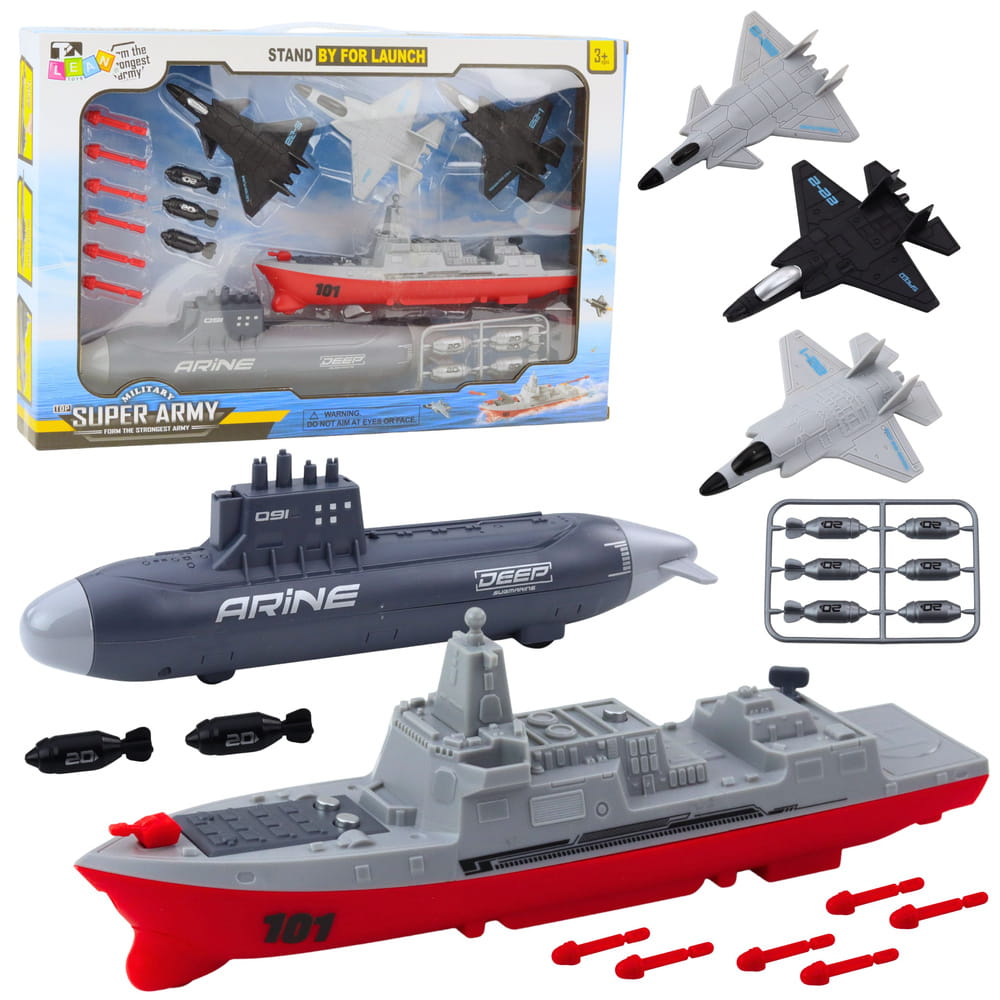 Zestaw militarny z lotniskowcem, łodzią podwodną oraz trzema samolotami myśliwskimi to wspaniała propozycja dla dzieci, które uwielbiają dynamiczną zabawę w wojsko, strategię i akcję. Zestaw zawiera wiele elementów, które pozwalają odgrywać różnorodne scenariusze bitew morskich i powietrznych. Zabawka rozwija wyobraźnię, kreatywność oraz zdolności manualne dziecka. Elementy zestawu zostały wykonane z tworzywa sztucznego i odwzorowują pojazdy wojskowe w uproszczonej, dziecięcej formie. Modele wyposażone są w miejsca montażu dołączonych rakiet oraz torped, co dodatkowo uatrakcyjnia zabawę. Całość zapakowana jest w estetyczne pudełko z okienkiem – idealne na prezent. Zestaw jest nie tylko zabawny, ale również edukacyjny, ucząc dzieci o współpracy i strategii w zabawie.
