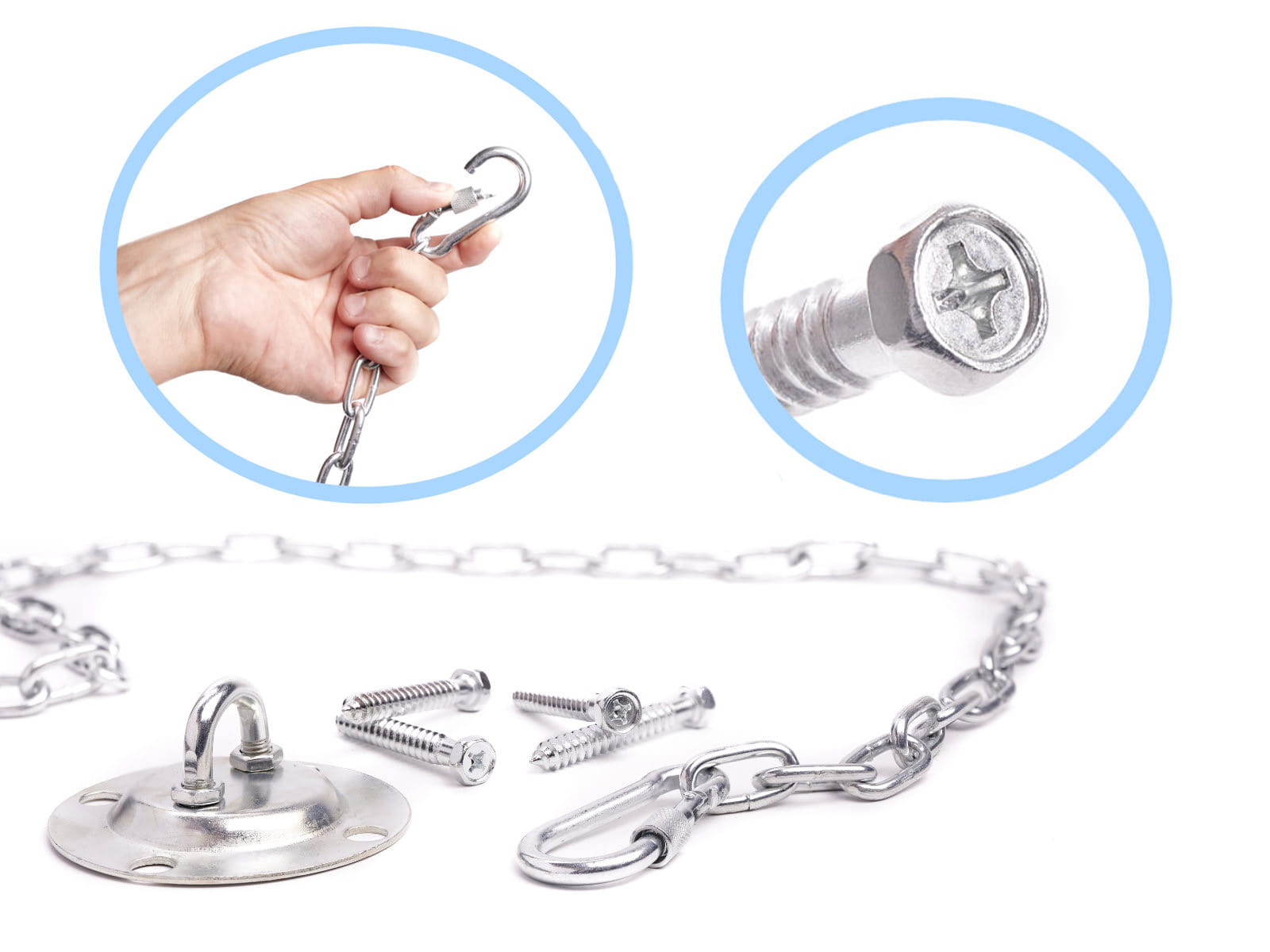HAK SUFITOWY DO MONTAŻU HUŚTAWEK + ŁAŃCUCH ZESTAW to idealne rozwiązanie dla każdego, kto pragnie stworzyć komfortową przestrzeń do relaksu. Dzięki trwałym i mocnym elementom, ten metalowy zestaw zapewnia udźwig do 200 kg, co czyni go doskonałym wyborem do montażu hamaków brazylijskich oraz huśtawek. Montaż jest prosty i szybki, a możliwość regulacji wysokości siedziska za pomocą łańcucha z karabinkiem sprawia, że każdy może dostosować go do swoich potrzeb. Zestaw można zamontować zarówno w drewnie, jak i betonie, co daje dużą elastyczność w wyborze lokalizacji. W skład zestawu wchodzi okrągły hak sufitowy, dwa karabińczyki oraz śruby montażowe, co czyni go kompletnym rozwiązaniem do zawieszenia. Niezależnie od tego, czy planujesz stworzyć przytulny kącik w ogrodzie, czy relaks w domu, ten zestaw sprawdzi się doskonale.