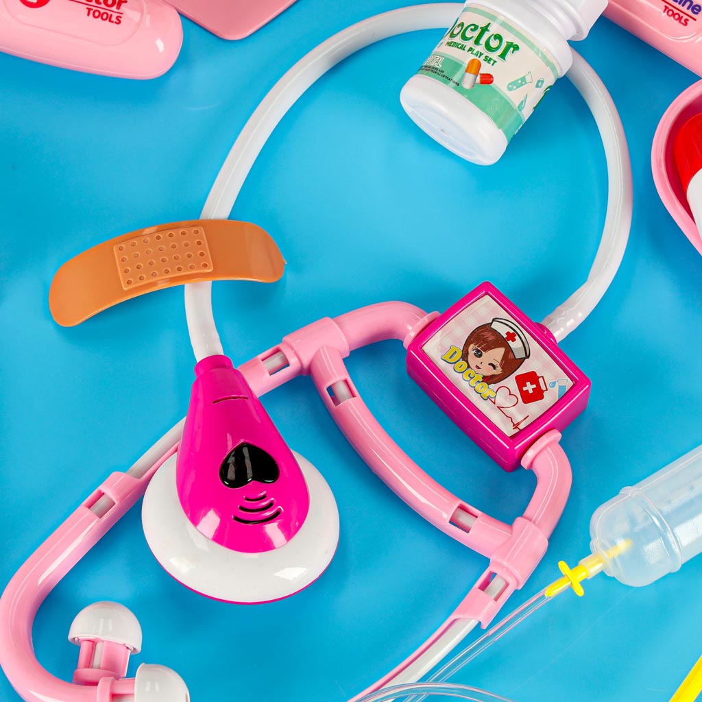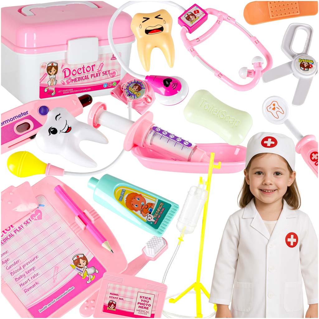 Zestaw małego lekarza kuferek strój lekarski 35 elementów to idealna zabawa dla każdego malucha, który marzy o byciu lekarzem lub pielęgniarką. Dzięki bogatemu zestawowi akcesoriów, dzieci mogą wcielić się w rolę specjalistów medycznych, co rozwija ich wyobraźnię i kreatywność. Fartuch i czepek dodają realizmu, a interaktywne elementy, takie jak świecący stetoskop, sprawiają, że zabawa staje się jeszcze bardziej emocjonująca. W zestawie znajdują się również przyrządy dentystyczne, co pozwala na naukę o higienie jamy ustnej. Dzieci mogą oswoić się z wizytami u lekarza, co jest szczególnie ważne w ich rozwoju. Zestaw ten nie tylko bawi, ale także uczy, wprowadzając dzieci w świat medycyny i zdrowia. Uroczy kuferek w kolorze biało-różowym sprawia, że zabawa jest jeszcze przyjemniejsza, a dzieci mogą organizować własne gabinety lekarskie w domu.