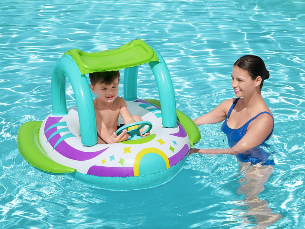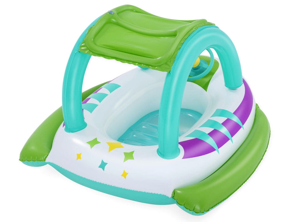 Dmuchany ponton przypominający swoim kształtem łódkę z kolorową kosmiczną grafiką to idealna propozycja od firmy Bestway® Space Splash ™ dla dzieci od 3 roku życia. Został stworzony specjalnie dla najmłodszych, którzy dopiero oswajają się z wodą i potrzebują dodatkowej ochrony. Ponton wyposażony jest w odpinaną osłonę przeciwsłoneczną UV Careful™, co zapewnia maluszkowi bezpieczeństwo przed słońcem oraz cień w upalne dni. Osłona mocowana jest na rzep, co ułatwia jej montaż i demontaż. Dodatkowym atutem pontonika jest dmuchane dno, które zapewnia komfort podczas rejsów po wodzie. W dnie łódki znajduje się okno typu peek-a-boo, które pozwala dziecku podziwiać podwodne widoki, a wbudowana kierownica z klaksonem dostarcza dodatkowej frajdy. Wykonany z wytrzymałego winylu, ponton z pewnością sprawi wiele radości podczas wodnych kąpieli w upalne dni, a także zapewni bezpieczeństwo i komfort każdemu maluchowi.