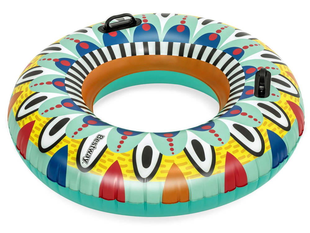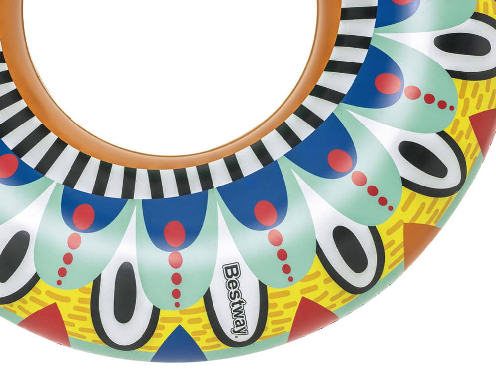 Zalotne, dmuchane koło do pływania Flirty Fiesta™ z serii Art Collection™ to najnowsza propozycja firmy Bestway® na wakacyjny sezon. Kolorowe, wyróżniające się koło z grafiką inspirowaną Aztekami zwróci uwagę innych plażowiczów. Dzięki średnicy 107 cm, jest idealne zarówno dla dzieci, jak i dorosłych, którzy chcą cieszyć się relaksem na wodzie. Dwa uchwyty zapewniają dodatkowe wsparcie, co sprawia, że koło jest doskonałe dla osób, które nie czują się pewnie w wodzie. Wbudowany zawór bezpieczeństwa kontroluje ciśnienie, co zwiększa komfort użytkowania. Wykonane z wytrzymałego materiału winylowego, koło jest odporne na uszkodzenia. Po opróżnieniu nie zajmuje wiele miejsca w bagażu, co czyni je idealnym towarzyszem wakacyjnych podróży.
